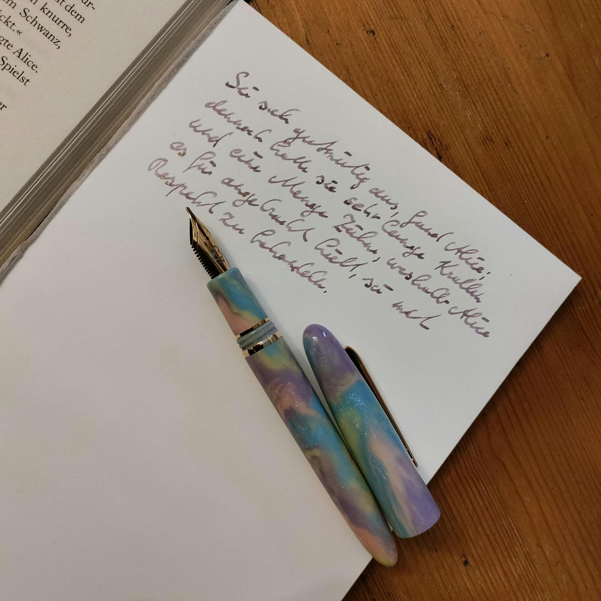 Der Füllhalter wird mit einem Konverter geliefert und kann mit Standardpatronen befüllt werden. Und er ist sehr liebevoll verpackt: er kommt mit eigener rosa Schlafbrille, Stickern und Türhänger in einer Geschenkverpackung.