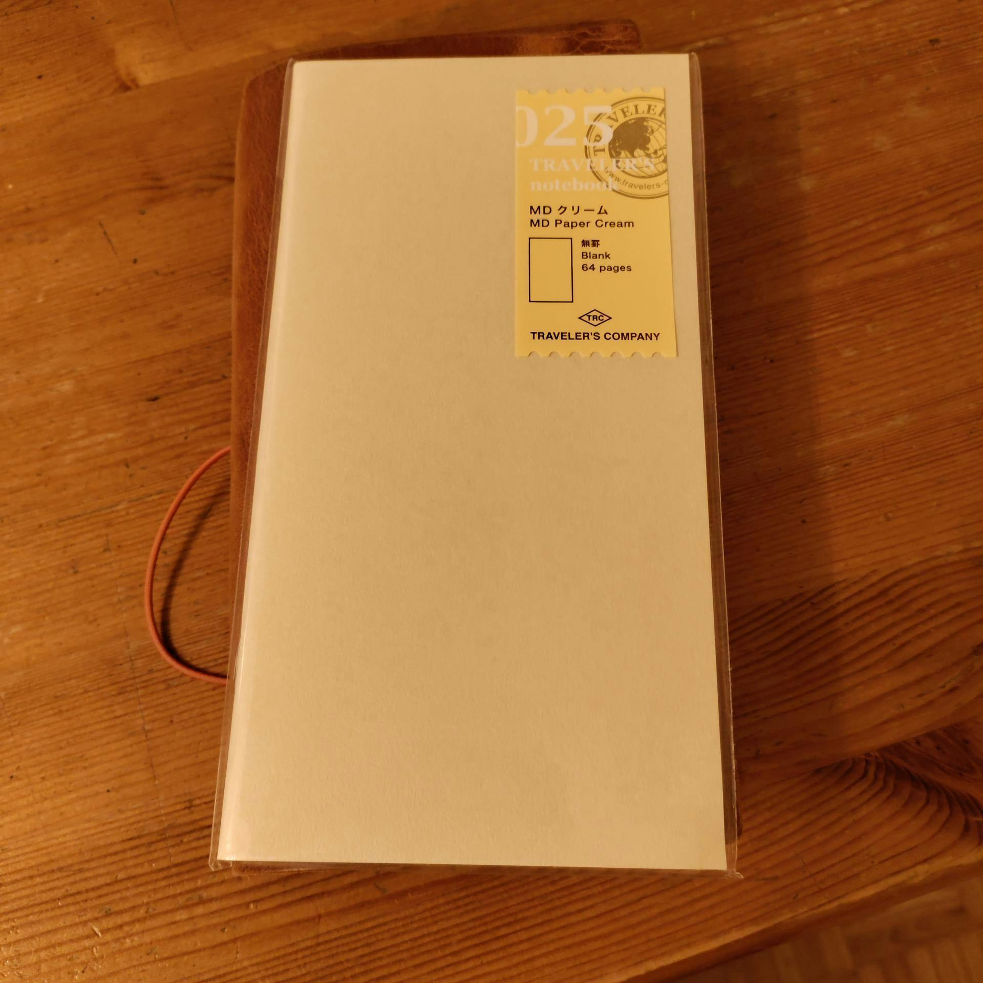 Ein Refill für das kultige Notizbuch Traveler's Notebook mit dem edlen Midori-Papier - blanko auf elfenbein-farbenem Papier.