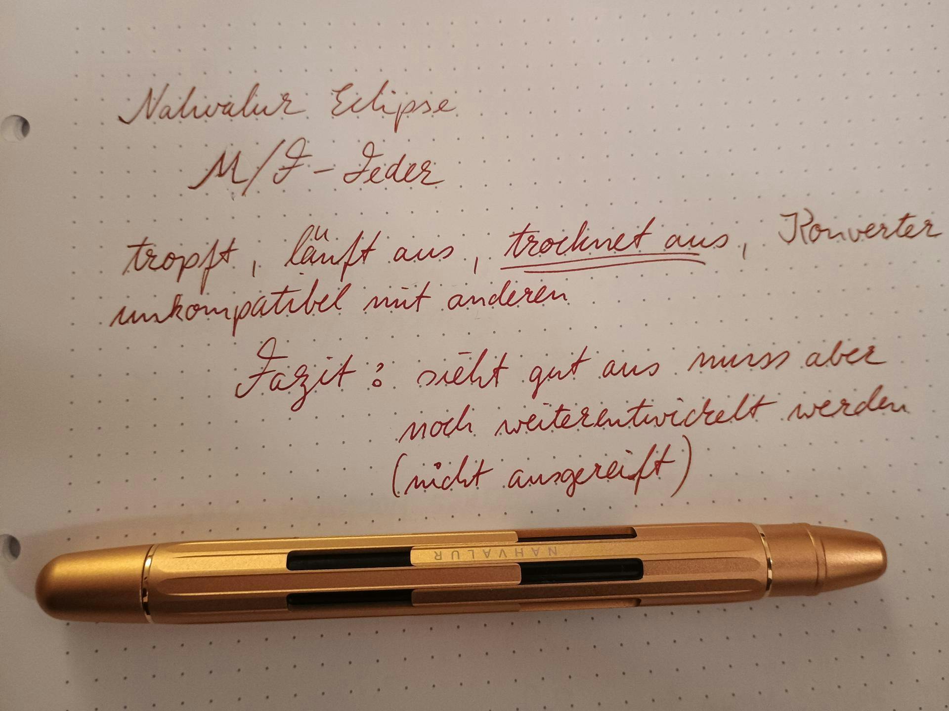 Eclipse ist der erste Capless-Füllhalter von Nahvalur und zeichnet sich durch ein innovatives Design aus: Er funktioniert ohne Knopf, stattdessen wird der ganze Körper zusammengedrückt, um den Mechanismus zu betätigen. Dadurch ist der Füllhalter etwas kleiner, wenn die Feder aktiviert ist.