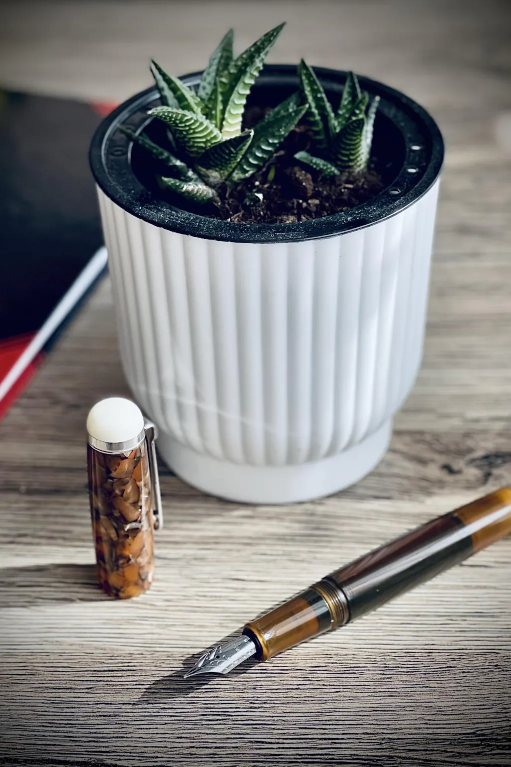 Der Omar von Opus 88 ist wieder ein Eyedropper, der klassische Elemente mit jungem Design verbindet. Bei dem Omar verbindet sich elfenbeinfarbenes Acryl an den Endkappen mit dem schönem schillernden Acryl der Endkappe. Und zur Betonung der Farbe ist der Korpus einfarbig, halbtransparent gehalten.