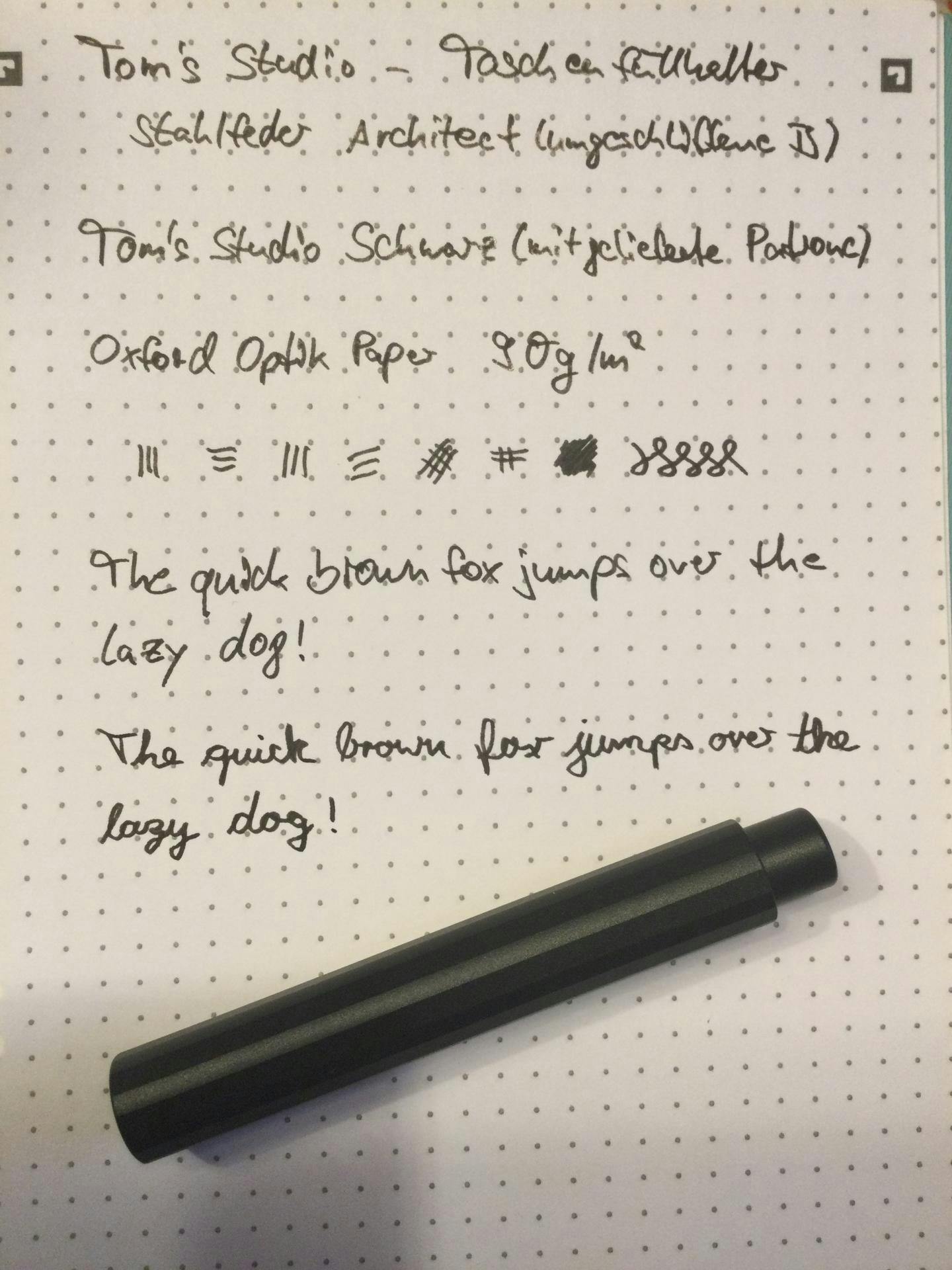 So lautet das Fazit von Nick Stewart über diesen Füllhalter. Dieser Füllhalter ist geschlossen gerade einmal 99 mm lang, aber mit aufgesteckter Kappe 163 mm und damit zum Teil deutlich länger als herkömmliche Füllhalter. Der Durchmesser der Kappe ist mit 14,5 mm auch schon recht ordentlich. ein angenehmer Griff ist aber garantiert bei einem Durchmesser des Griffstücks von 10,1 mm und einer sehr leicht geriffelten Oberfläche. Der Füllhalter wiegt 27 g inklusive Patrone.