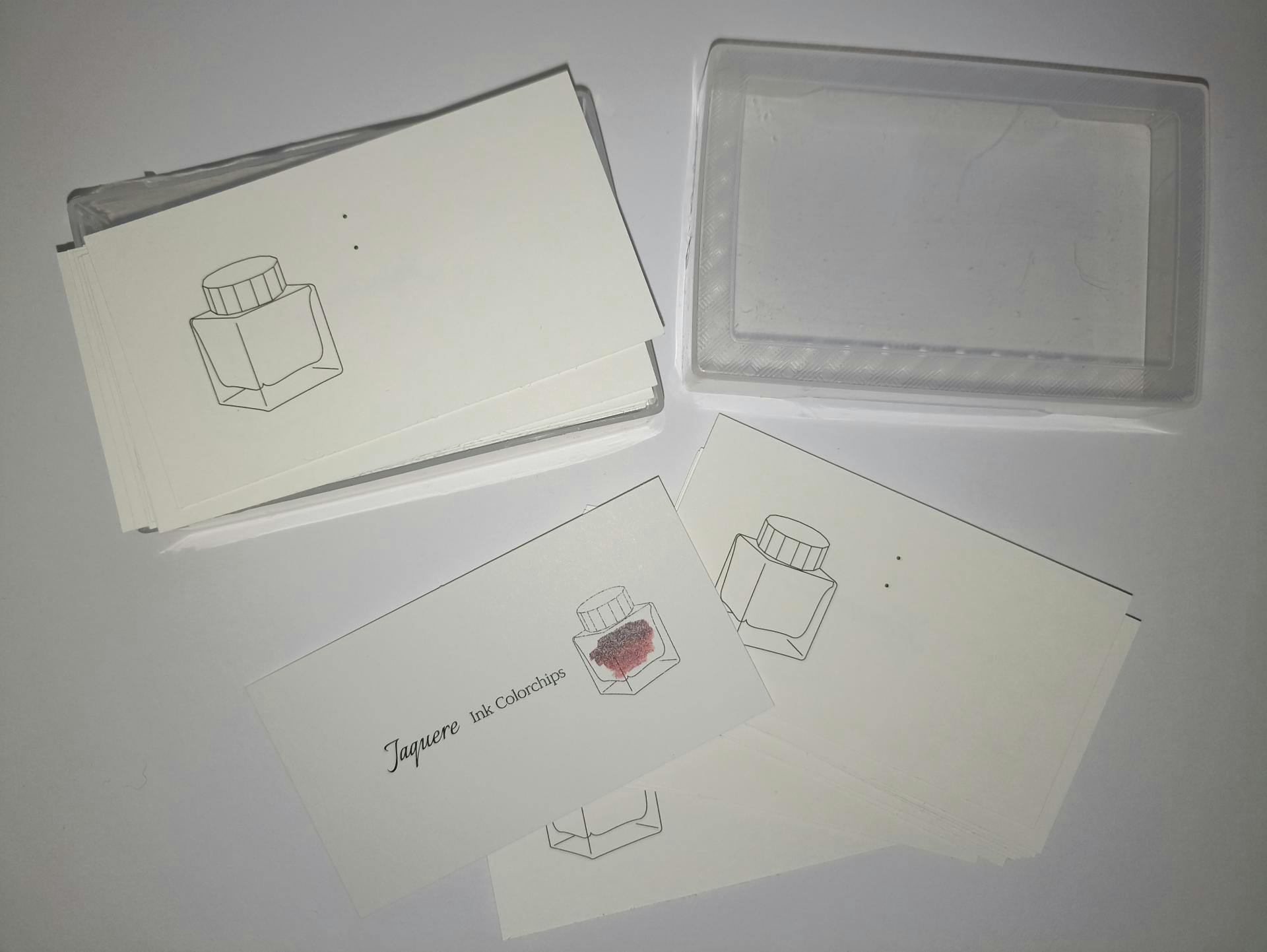 Naja, lange Rede, kurzer Sinn. Die Kärtchen kamen, erfreulicherweise in einer kleinen Plastikschachtel, ähnlich wie von Kartenspielen. So fliegen sie nach dem Auspacken nicht wild umher. Das Papier ist toll und man kann die Tinte wunderbar swatchen. Ich habe mit Glasfeder, Wattestäbchen und gedippter F-Feder getestet. So hat man eine tolle Übersicht über die Tinten.